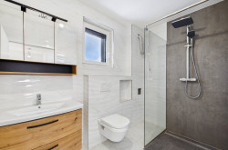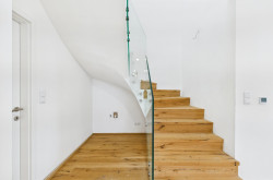 Die Auswahl der Materialien spiegelt einen hohen Qualitätsanspruch wider. Sowohl die Fenster als auch die flächenbündige Hauseingangstüre stammen vom namhaften Hersteller REKORD. Akzente setzen zudem die anthrazitfarbenen Aluminium-Außenfensterbänke der Firma Helopal. In den Wohnräumen sorgt edler Parkettboden für ein natürliches Wohngefühl, während das Badezimmer mit modernem Feinsteinzeug sowie Handwaschbecken, WCs und Duschen ausgestattet ist.