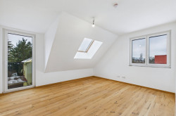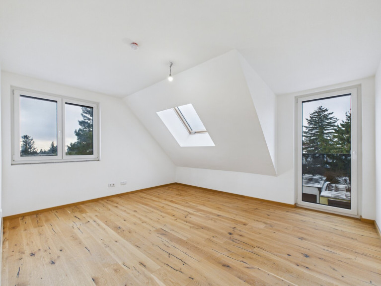Über die Stiege gelangt man ins Dachgeschoss, das ganz dem Rückzug gewidmet ist. Drei helle Zimmer bieten vielseitige Nutzungsmöglichkeiten – ob als Schlafzimmer, Kinderzimmer oder Homeoffice. Ein weiteres Badezimmer rundet das Raumangebot dieser Ebene ab.