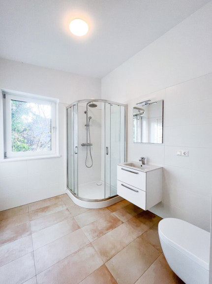 - ein geräumiges Badezimmer mit Dusche und Toilette
