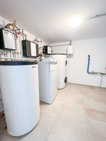 Es sind 2 Autoabstellplätze vorhanden. Die Beheizung und Kühlung erfolgt über eine Fußbodenheizung bzw. Fussbodenkühlung mit einer effizienten Erdwärmepumpe von Vaillant. Ein 375 Liter Warmwasserspeicher ist installiert.