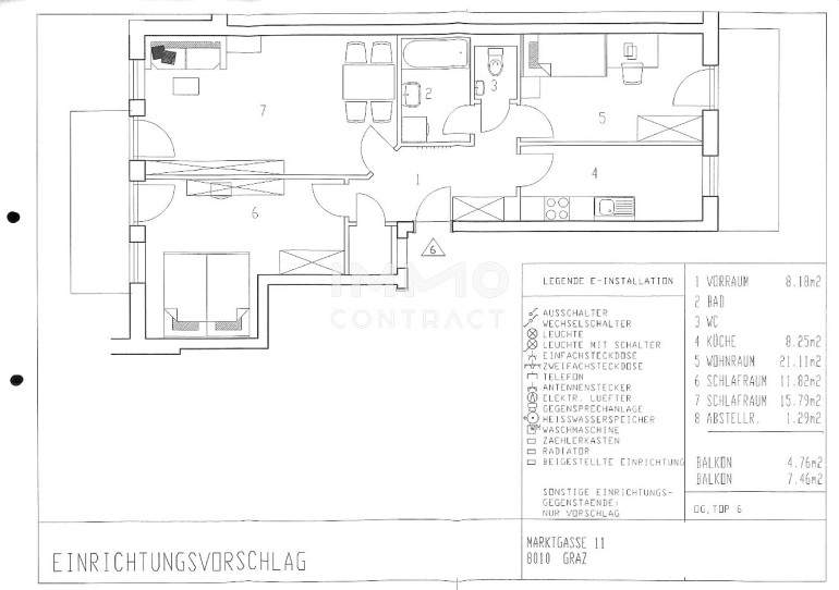Raumaufteilung: Vorraum, Küche, Wohnzimmer, 2x Schlafzimmer, Bad, Toilette, Abstellraum, Kellerabteil, 2x Balkon