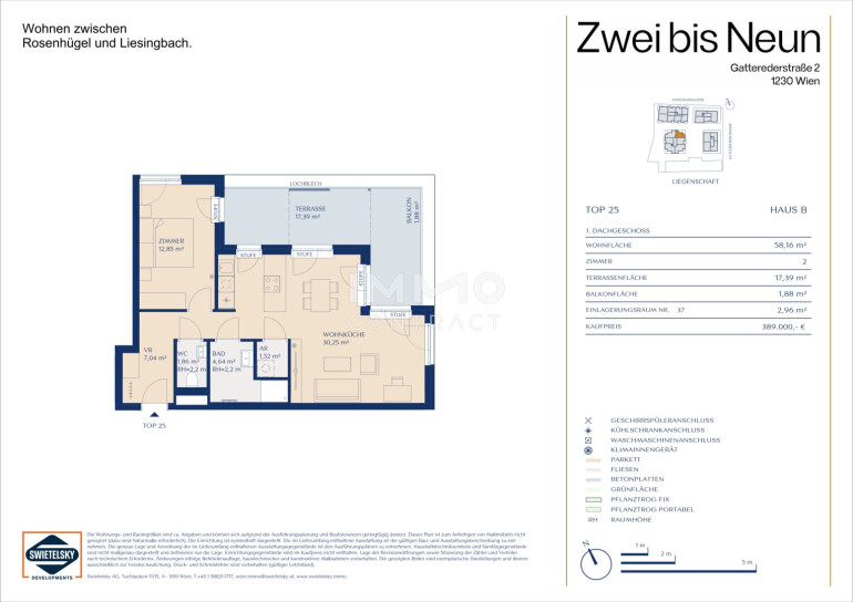 Die Lage des Projekts bietet das Beste aus beiden Welten: Die lebendige Stadt ist nur einen Katzensprung entfernt, während die umliegenden Grünflächen und der Liesingbach zum Durchatmen und Entspannen einladen. Zahlreiche Nahversorger wie Supermärkte, Drogerien und Apotheken befinden sich nur wenige Schritte entfernt, und auch ein Kindergarten liegt in unmittelbarer Nähe. Für kulinarische Genüsse sorgen namhafte Weingüter, Heurige und Gasthäuser während das Einkaufszentrum Riverside eine Vielzahl an Einkaufs- und Freizeitmöglichkeiten bietet. Sport- und Naturbegeisterte finden im Liesingbachgebiet und im neu geschaffenen Stadtpark Atzgersdorf ideale Orte für Spaziergänge, Laufrunden und Erholung. Selbst das beliebte Liesinger Bad ist mit dem Fahrrad in weniger als zehn Minuten erreichbar. Der nahegelegene Autobus bringt Sie in nur 13 Minuten nach Hietzing, und der Schnellbahn-Bahnhof Atzgersdorf ist lediglich eine kurze Spazierstrecke oder eine zweiminütige Busfahrt entfernt. Von dort aus erreichen Sie die zentralen Verkehrsknotenpunkte Wien Meidling und Wien Hauptbahnhof in nur sechs bzw. zwölf Minuten. Diese gute Anbindung macht das Projekt zur idealen Basis für ein urbanes Leben im Grünen – auch ohne eigenem Auto!Beschreibung der Immobilie