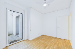 Links vom Wohnbereich führt ein separater Trakt zu den beiden privaten Zimmern. Das größere der beiden ist perfekt als Hauptschlafzimmer geeignet und bietet Raum für einen großzügigen Schrankbereich. Das zweite, gut proportionierte Zimmer ist vielseitig nutzbar – ob als Kinderzimmer, Home-Office oder Gästezimmer. In allen Wohnräumen sorgt der Parkettboden für eine warme, behagliche Wohnatmosphäre.