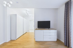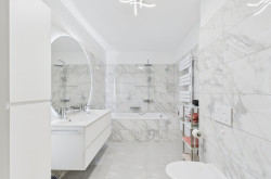 Komplettiert wird das Raumangebot durch das zentral und praktisch gelegene, stilvolle Badezimmer mit Badewanne. Es beeindruckt durch großformatige Fliesen in Marmor-Optik, einen breiten Doppelwaschtisch mit Unterschrank und einen beleuchteten Design-Spiegel. Ein separates WC mit Handwaschbecken rundet das Angebot funktional ab.
