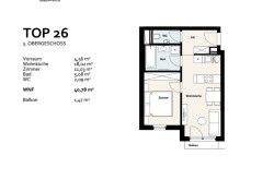 Die Wohnung Top 26 befindet sich im 5. Obergeschoss eines modernen Wohngebäudes. Mit einer Wohnfläche von 40,78 m² bietet diese charmante Wohnung alles, was man für einen komfortablen Aufenthalt benötigt. Der Vorraum mit 4,56 m² führt in die großzügige Wohnküche, die mit 18,02 m² reichlich Platz bietet und über einen gemütlichen Essbereich verfügt. Das stilvoll möblierte Zimmer mit 11,03 m² bietet ausreichend Stauraum und eine angenehme Schlafmöglichkeit. Das Badezimmer mit 5,08 m² ist mit einer Badewanne und modernen Sanitäreinrichtungen ausgestattet, während das separate WC mit 2,09 m² zusätzlichen Komfort bietet. Ein besonderes Highlight ist der Balkon mit 1,47 m², der einen kleinen, aber feinen Außenbereich für entspannte Momente bietet.
