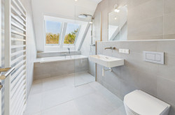 - Echtholz-Parkettböden, großformatige Fliesen in den Sanitärräumen