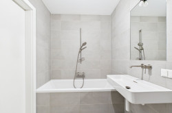 - Echtholz-Parkettböden, großformatige Fliesen in den Sanitärräumen