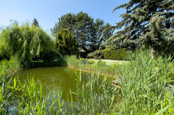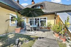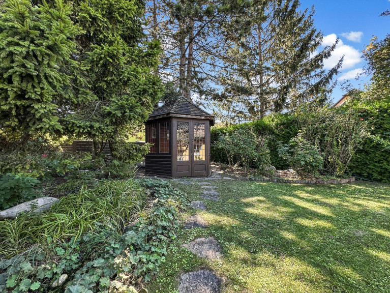 Das Highlight des Hauses ist zweifellos der große Garten, der von einer gepflegten Hecke umgeben ist. Der Teich, im Verbund mit einer großen Terrasse, bildet das Wohlfühl-Zentrum des Gartens und reichlich Platz für Wasserpflanzen und Fische. Der Garten bietet viel Raum für Kinder zum Spielen oder zum Entspannen und Verweilen im Freien.