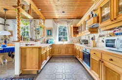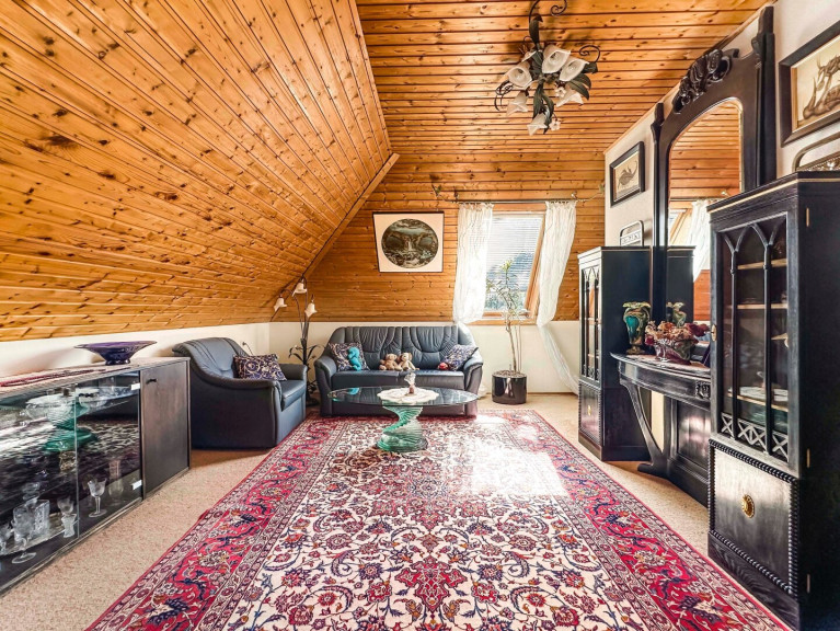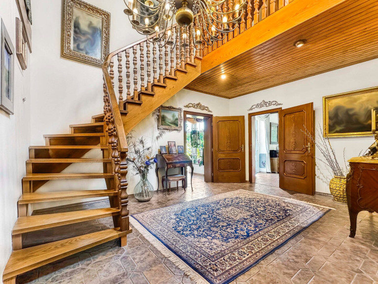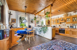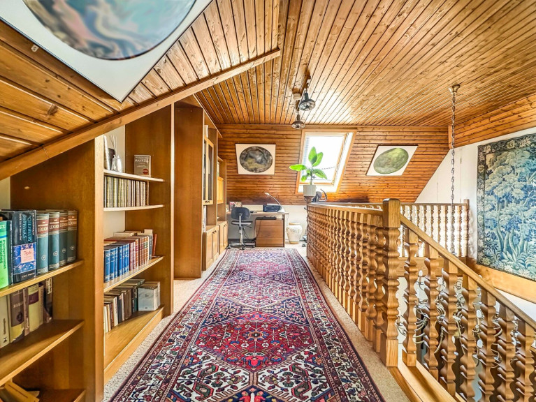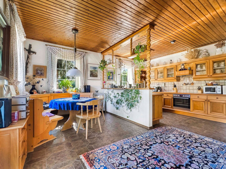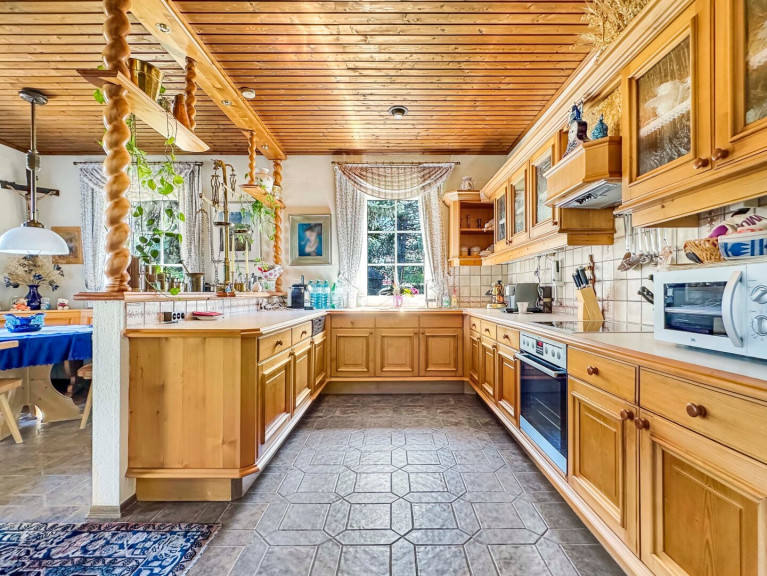 Ein sehr durchdachtes und gut organisiertes Haus. So gibt es ein Staubsaugersystem, bei dem direkt in den Keller abgesaugt wird. Der offene Kamin hat ebenfalls schon eine Aufbereitung, durch welche die Asche direkt im Keller entnommen werden kann, damit kein Staub im Wohnzimmer bleibt. Von 3-fach verglasten Fenstern, zu einer modernen Wasser-Wasser-Wärmepumpe, wurde immer auf einen bestmöglichen Zustand und Nutzung geachtet. Ein weiteres Detail ist der alte Holzofen in der Küche, der mit tollen alten Küchenaccessoires ausgestattet ist. Abgerundet von einem Glashaus, das vom Haus über die Garage als auch direkt vom Garten zugängig ist, schafft Platz für die besonderen Pflanzen.