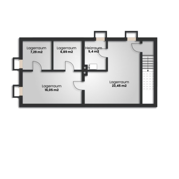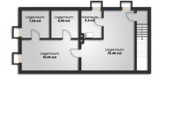 Im Untergeschoss befindet sich der Keller, welcher mehrere Lagerräume sowie den Heizraum beherbergt. Das Haus verfügt außerdem über eine Garage, die Platz für ein Auto bietet und ein Glashaus.