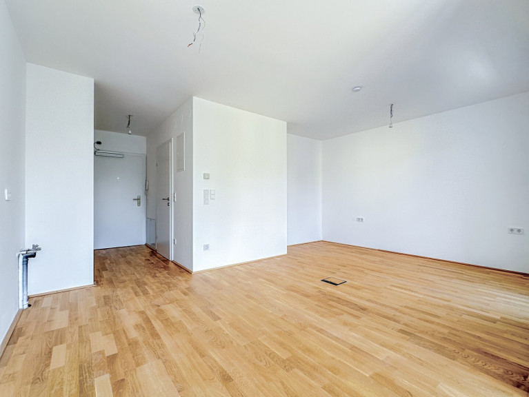 Im 2. Liftgeschoss befindet sich diese smarte 1-Zimmer-Wohnung. Vom Vorraum aus gelangen Sie in das Badezimmer, das mit einer Dusche, einem WC und einem Waschmaschinenanschluss ausgestattet ist. Anschließend betreten Sie die über 22 m² große Wohnküche, die ausreichend Platz für einen Wohnbereich, eine Küche und ein Bett bietet. Alternativ kann die Wohnküche auch mit einer ausziehbaren Couch eingerichtet werden. Die angrenzende 3,50 m² große Loggia bietet die Möglichkeit, eine ganz persönliche Wohlfühloase zu gestalten.