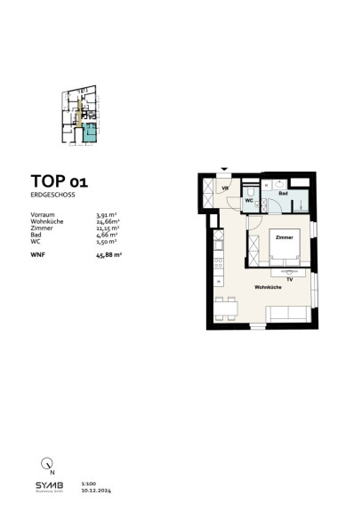 Diese zum Kauf stehende Erdgeschosswohnung bietet eine Wohnfläche von 45,88 m². Der durchdachte Grundriss umfasst ein einladendes Vorzimmer, von dem aus Sie sowohl das separate WC als auch den großzügigen, L-förmigen Wohnbereich mit über 24 m² erreichen. Das Schlafzimmer mit einer Fläche von über 11 m² verfügt über einen direkten Zugang zum angrenzenden Badezimmer, das mit einer Dusche und einem Waschmaschinenanschluss ausgestattet ist.