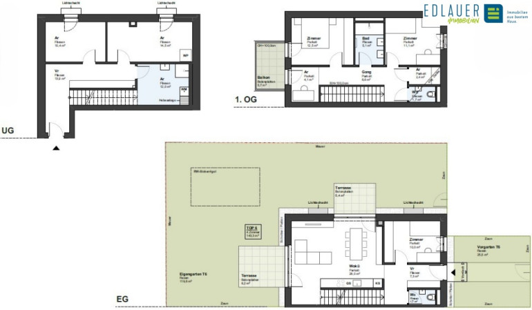 Die über ein Untergeschoß, Erdgeschoß und Obergschoß geplante Einheit Top 6 mit ca. 143,3 m² Wohnnutzfläche (inkl. Kellerfächen von ca. 50,8 m²), einer Terrasse von ca. 13,6 m² und einem Garten mit ca. 145,3 m² sowie einem Balkon mit ca. 5,7 m² verfügt über folgende Raumaufteilung: