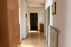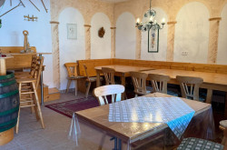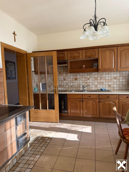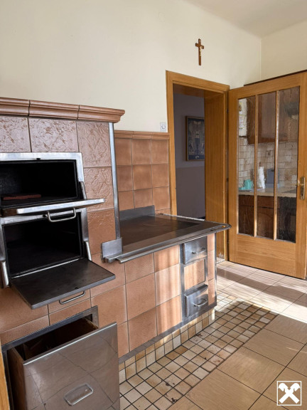 Vorraum/Flur, Abstellraum, Küche mit Essbereich und Holzofen, Wohnzimmer, zwei Schlafzimmer, ein großes Badezimmer, separates WC. Von hier besteht zudem Zugang zum Wirtschaftstrakt mit zusätzlichem WC, Waschküche, Kellerabgang und Garagenzugang.