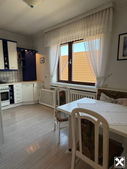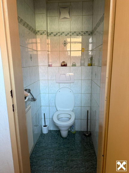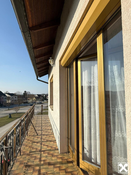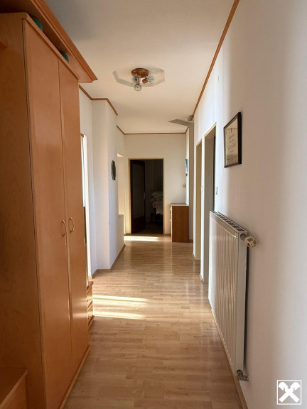 Obergeschoss: Küche mit Essecke, ein Wohnzimmer, drei Zimmer, Bad, separates WC sowie der Zugang zum Dachboden. Straßenseitig ergänzt ein Balkon mit ca. 12 m² das Raumangebot.