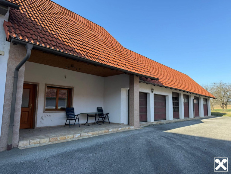 Zur Liegenschaft gehören mehrere Nebengebäude und Garagen, darunter eine Laube bzw. ein Hobbyraum (ca. 30 m²), eine große Doppelgarage sowie eine hohe Garage mit vier Toren, die vielfältige Nutzungsmöglichkeiten bieten.