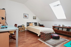 Das Dachgeschoss, welches über eine weitere Treppe erreichbar ist, gliedert sich in einen Flur, zwei getrennt begehbare Schlafräume, ein Duschbad mit Handwaschbecken sowie eine Toilette. Direkt vom Flur und den Zimmern ist eine ca. 36 m2 große Terrasse begehbar. Der angrenzende Garten im Dachgeschoss ergibt sich durch die außergewöhnliche Hanglage. Ein ca. 3 m2 großer Abstellraum für Terrassenmöbel komplettiert diese gelungene Raumaufteilung.