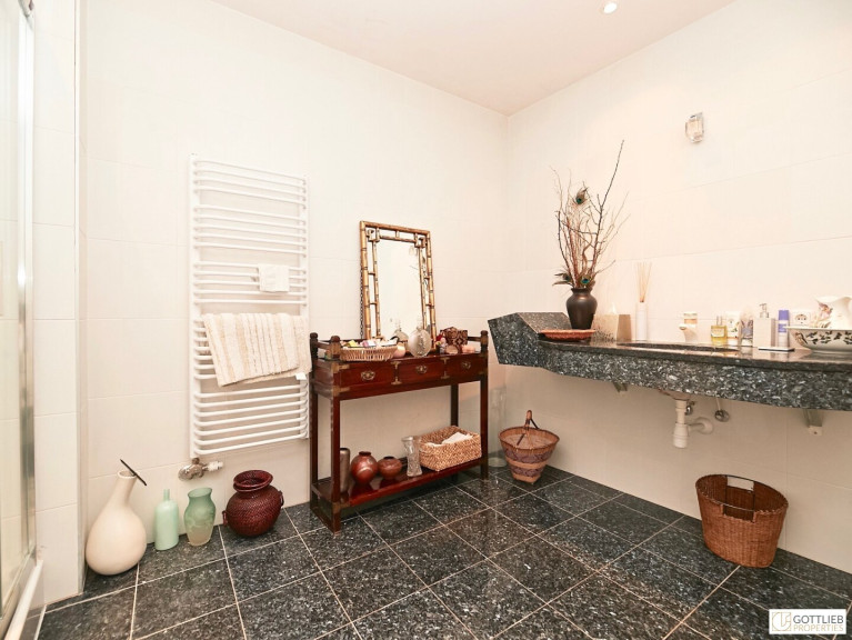 Über eine Treppe gelangt man ins Obergeschoss zu einem lichtdurchfluteten, geräumigen ca. 53 m2 großen Wohn-Ess-Bereich mit offener Küche und angrenzendem Abstellraum sowie dem Master Bedroom mit begehbarer Garderobe, Wannenbad und Dusche, Doppelhandwaschbecken, Handtuchwärmer sowie separater Toilette.