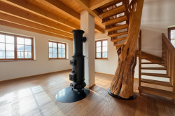 - Interieur-Design: Offene Galerie und massiver Apfelbaumstamm als zentraler Blickfang im Wohnbereich