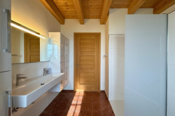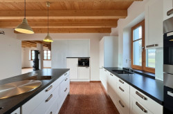 Eine beeindruckende Galerie mit hochwertigen Holzgeländern bietet einen freien Blick in den Wohnbereich. Weiters befindet sich auch die autarke Einliegerwohnung mit Wohn- und Schlafzimmer sowie Bad und WC im Dachgeschoss. Etwaige Anschlüsse für eine Küche sind bereits vorhanden.