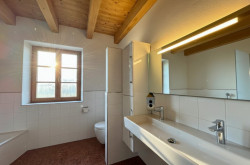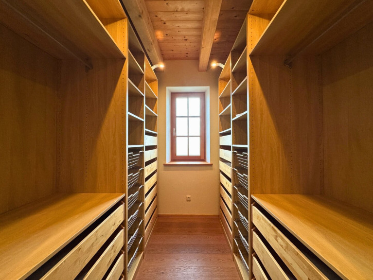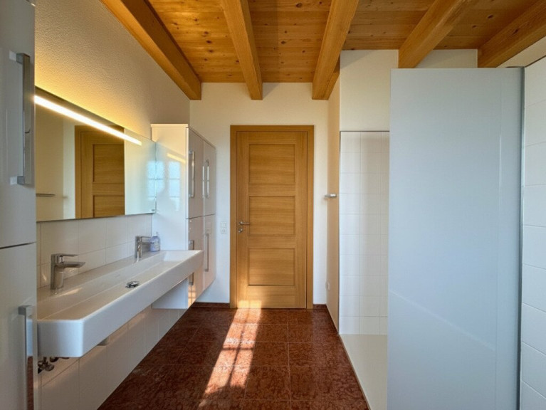 Lichtdurchfluteter Wohn- und Essbereich mit Sichtdachstuhl und direktem Zugang zur Terrasse. Die hochwertige Küche mit Steinplatte und Speisekammer, ein stilvolles Badezimmer mit Dusche und Badewanne sowie ein einladender Windfang runden das Angebot ab. Weiter verfügt es im Erdgeschoss über ein Schlafzimmer und eigenere Ankleide.