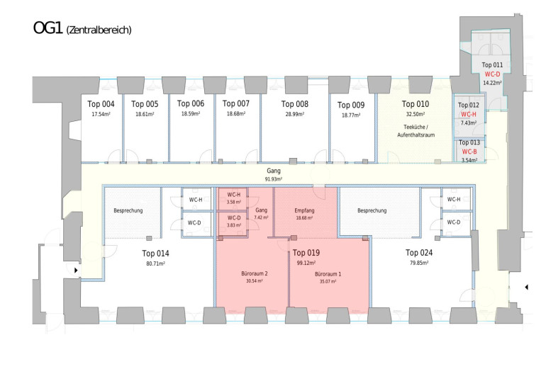 Bürofläche mit ca. 100 m² – zentrale Aufteilung mit Lift und Gemeinschaftsbereichen