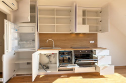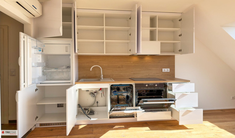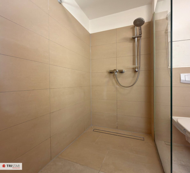 Parkett, Fliesen, Fußbodenheizung, Einbauküche, Wohnküche / offene Küche, Dusche