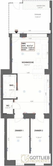 Man betritt die Wohnung im Innenhof durch den Eigengarten sowie über die ca. 11,50 m² große Terrasse und gelangt unmittelbar in die gemütliche, ca. 35,57 m² große Wohnküche. Von hier aus erreicht man ebenso zentral die separate Toilette, das Duschbad sowie zwei Schlafzimmer mit ca. 13,33 m² und 11,26 m² Größe.