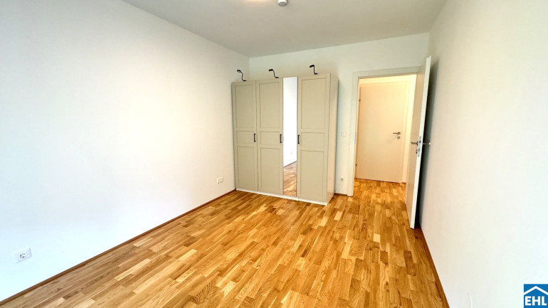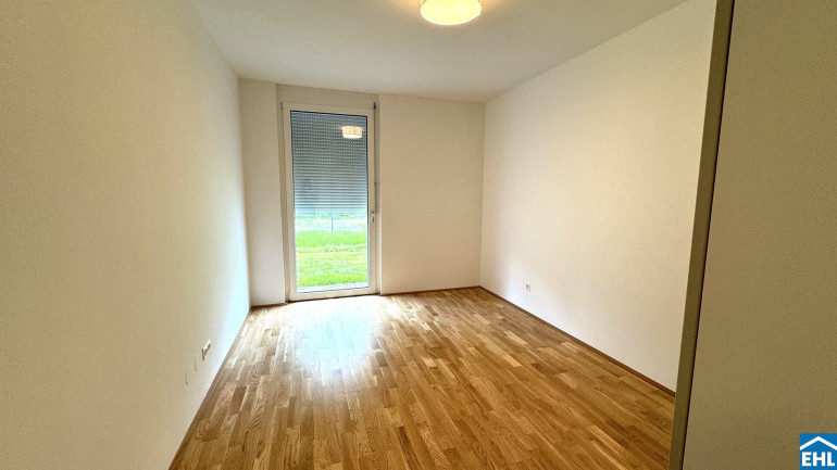 Die 3 Zimmerwohnung ist westseitig in Richtung eines wunderschönen Grüngürtels ausgerichtet und somit absolut ruhig gelegen. Sowohl von der Wohnküche, als auch von den beiden Schlafzimmern aus, gelangen Sie direkt in den Eigengarten, der weiters über eine teilweise überdachte Terrasse verfügt.