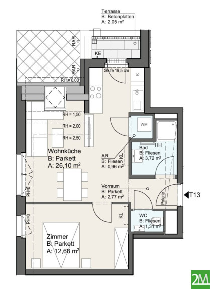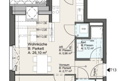 Die zum Kauf angebotene 2-Zimmer-Wohnung befindet sich auf Stiege 2 im 2. Dachgeschoß des gegenständlichen Projekts, hat eine Wohnfläche von rd. 48m² sowie eine kleine Terrasse mit rd. 2m².