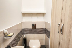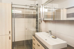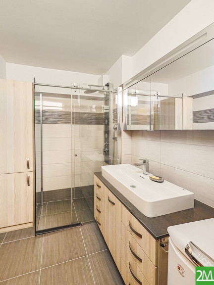 - Badezimmer mit Dusche, Handwaschbecken und Waschmaschinenanschluss sowie separates WC