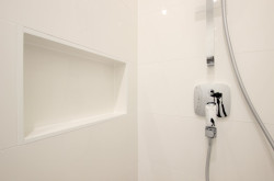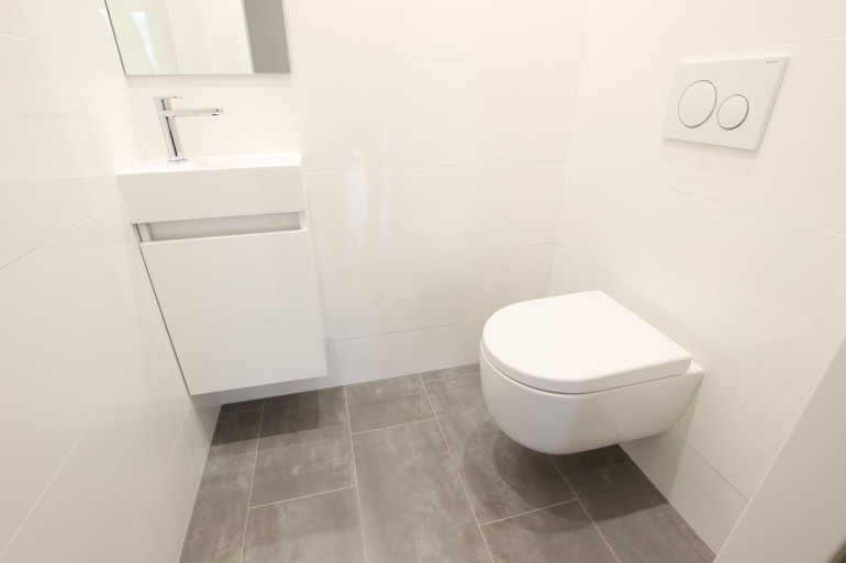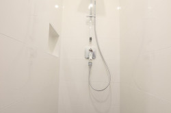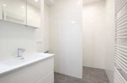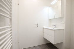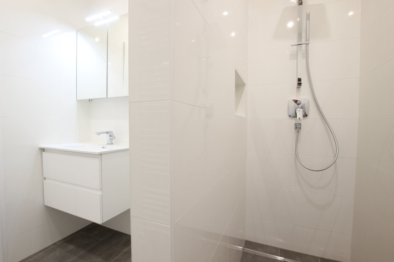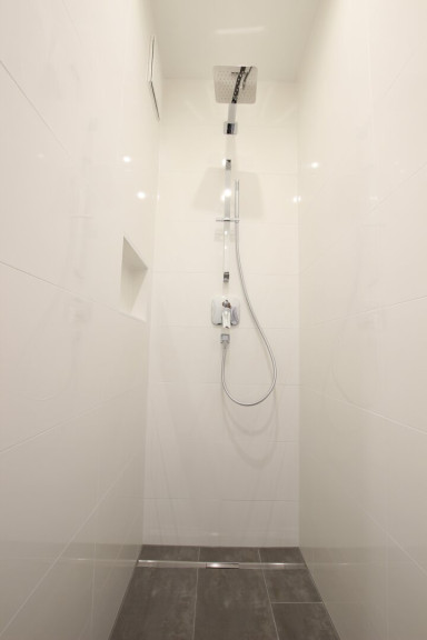 Das Badezimmer ist mit einer modernen Walk-In Dusche mit Edelstahl-Abflussrinne, Handtuchheizkörper und Waschmaschinenanschluss ausgestattet. Außerdem sorgt ein attraktiver Waschtisch und Spiegelschrank für Styling im Badezimmer.