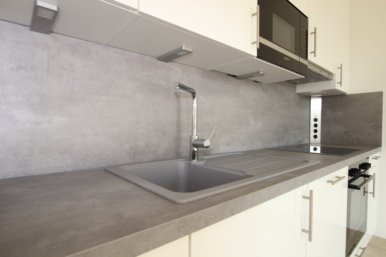 Eine elegante EWE-Einbauküche (weiße Fronten), mit Siemens Geräten, inkl. Einbau-Edelstahl-Mikrowelle und Geschirrspüler lässt keine Wünsche offen.