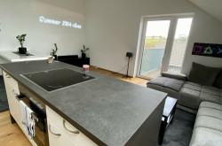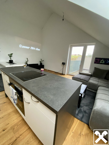 Das Herzstück der Wohnung ist der offene Wohn- und Essbereich mit integrierter Kücheninsel, der viel Raum für gemeinsames Kochen, Essen und Entspannen schafft.