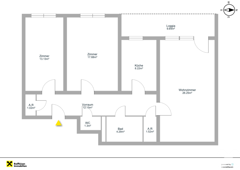 Die Wohnung überzeugt durch ihre praktische Raumaufteilung sowie durch die westseitig ausgerichtete Loggia, die besonders in den Nachmittags- und Abendstunden angenehme Sonnenstunden und einen schönen Ausblick bietet.