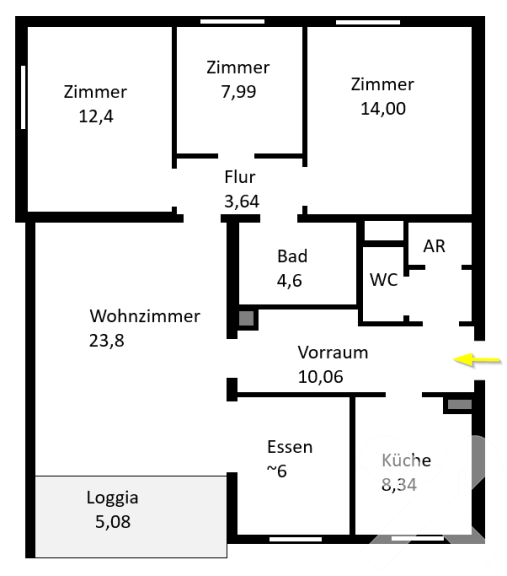 Vorraum, Abstellraum, WC, Küche möbliert, großer Wohn-/Essbereich mit Ausgang auf die Loggia, 3 Schlafzimmer, Bad mit Wanne.