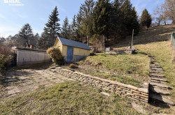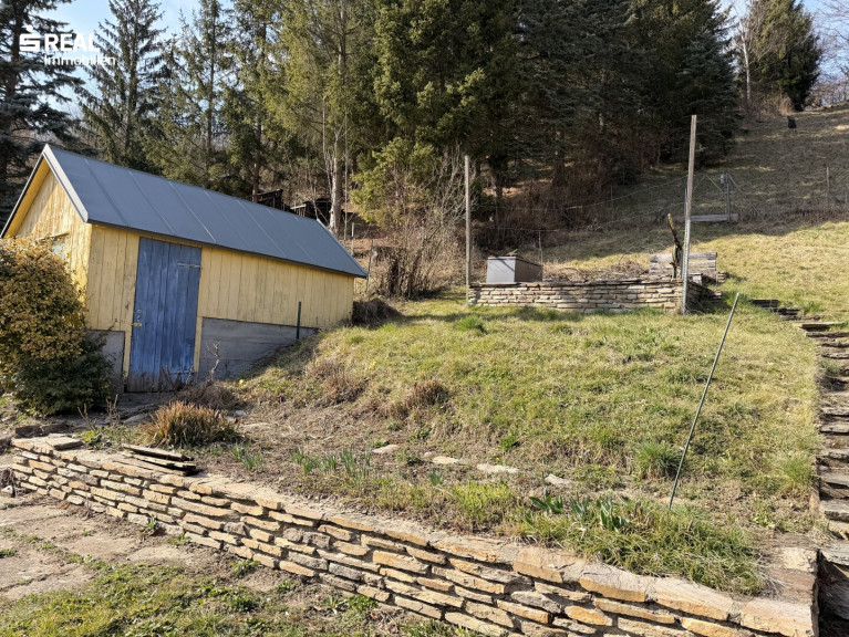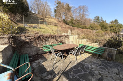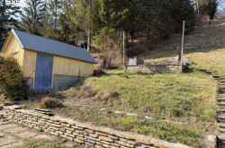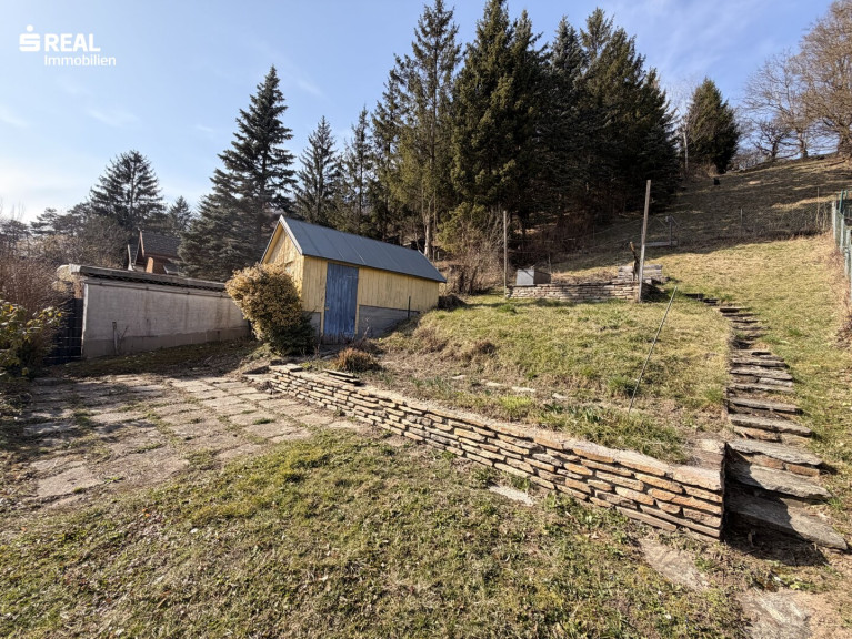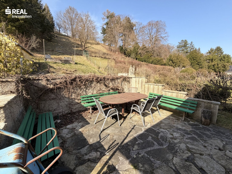 Vor und hinter dem Haus befinden sich ebene Terrassenflächen. Der weitere Garten ist terrassenförmig angelegt und durch einen Zaun vom anschließenden landwirtschaftlichen Grundstück getrennt.
