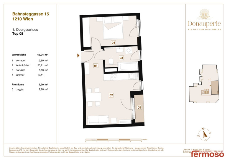 Im modernen Wohnprojekt „Donau Perle“ in der Bahnsteggasse 15 erwartet Sie diese 2-Zimmer-Neubauwohnungmit idealem Grundriss und hochwertiger Ausstattung. Die Wohnung bietet auf ca. 43,24 m² Wohnfläche und einer Loggia mit 2,20 m² ein durchdachtes Wohnkonzept – perfekt für Singles oder Paare, die modernes Wohnen in ruhiger Lage schätzen.