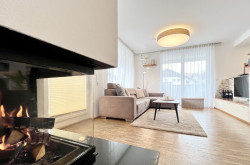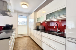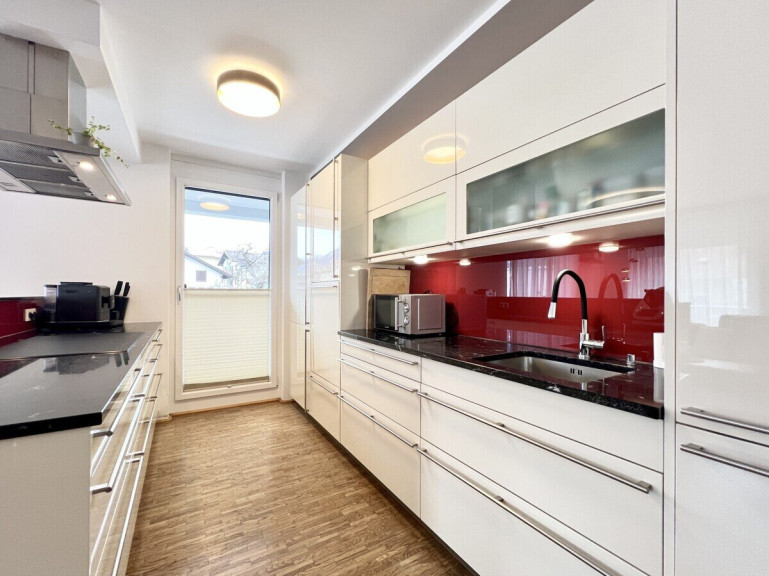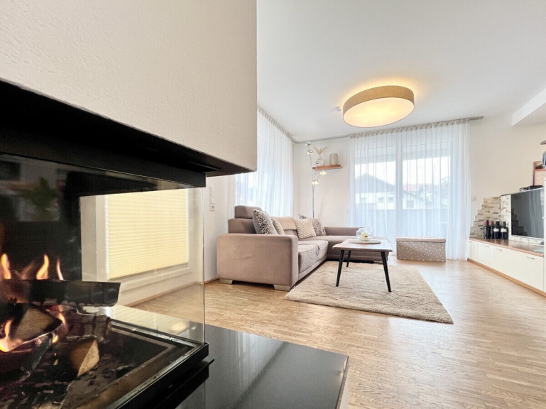 Herzstück der Wohnung ist der großzügige Wohn- und Essbereich mit offener Küche und großen Fensterflächen, die für eine besonders helle und freundliche Atmosphäre sorgen. Ein stilvoller Holzofen schafft zusätzlich eine gemütliche Wohnstimmung. Von hier aus gelangen Sie direkt auf die sonnige Terrasse mit Südwest-Ausrichtung – ein perfekter Ort für entspannte Stunden im Freien.