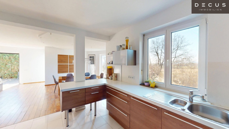 Der großzügige Wohn- und Essbereich bildet das Herzstück des Hauses. Große Öffnungen schaffen eine direkte Verbindung zur Terrasse mit rund 16 m², wodurch sich der Wohnraum harmonisch nach außen erweitert.