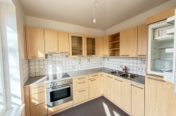 Küche/Kochnische: E-Herd mit Ceranfeld (Neff), Spülbecken mit Einhebelmischbatterie.