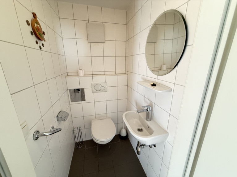 WC: Tiefspülklosett als Hänge-WC mit eingebautem Spülkasten, Sitzbrett mit Deckel, Handwaschbecken und Einhebelmischbatterie ausgestattet.