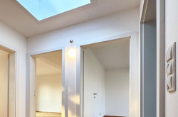 Dachgeschoss: 2 Schlafzimmer, Badezimmer, Abstellraum, Diele.