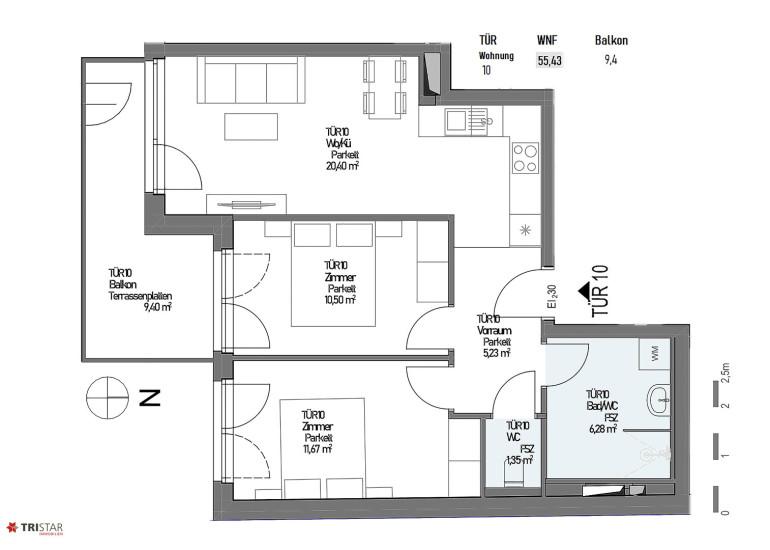Die Wohnfläche beträgt ca. 55,50 m² zuzüglich eines Balkons mit ca. 9,50 m², der sowohl von der Wohnküche als auch vom Schlafzimmer aus begehbar ist.