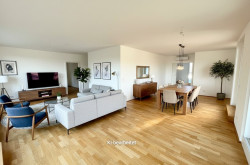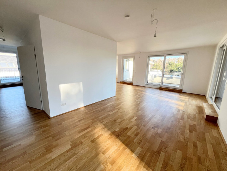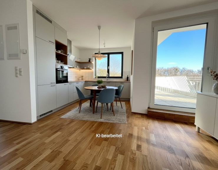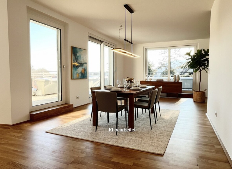 Der Wohn-Essbereich mit anschließender Küche ist mit über 53 m2 äußerst großzügig gestaltet und verfügt über mehrere Ausgänge auf eine der beiden Terrassen. In der Küche können Sie sich beim Kochen verwirklichen. Alle notwendigen Anschlüsse sind vorhanden, sodass Sie Ihre neue Traumküche nach Ihren Wünschen und Bedürfnissen gestalten können.