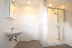 Das Badezimmer ist mit einer großzügigen Dusche und einem Waschmaschinenanschluss ausgestattet. Außerdem sorgt ein Spiegelschrank für Styling im Badezimmer.