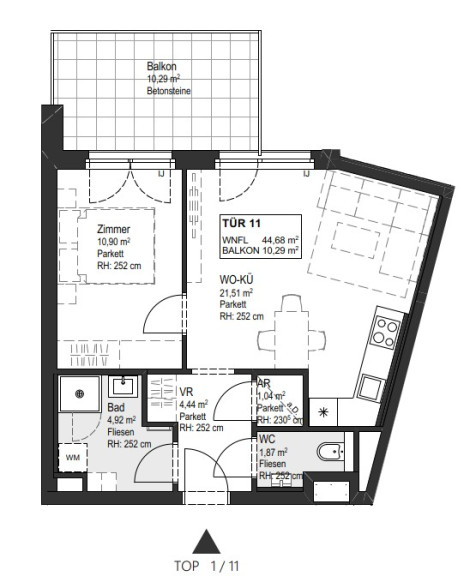 Fliesen, Parkett, Fußbodenheizung, Einbauküche, Westbalkon, Dusche