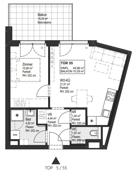 Fliesen, Parkett, Fußbodenheizung, Einbauküche, Westbalkon, Dusche