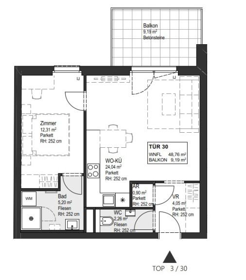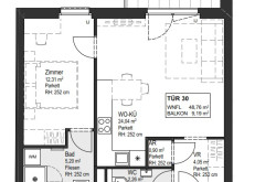 Fliesen, Parkett, Fußbodenheizung, Einbauküche, Westbalkon, Dusche