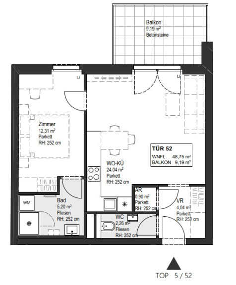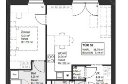 Fliesen, Parkett, Fußbodenheizung, Einbauküche, Westbalkon, Dusche